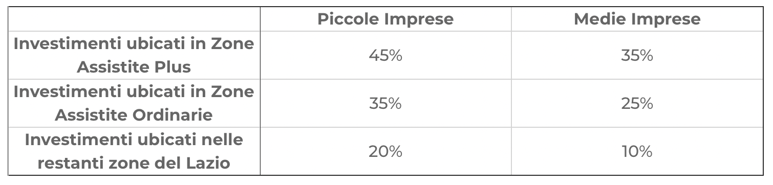 L’agevolazione è un contributo a fondo perduto e l’intensità di aiuto concedibili sugli investimenti variano a seconda dell’ubicazione dell’unità produttiva interessata e della dimensione dell’impresa beneficiaria, e sono riportate nella seguente tabella: