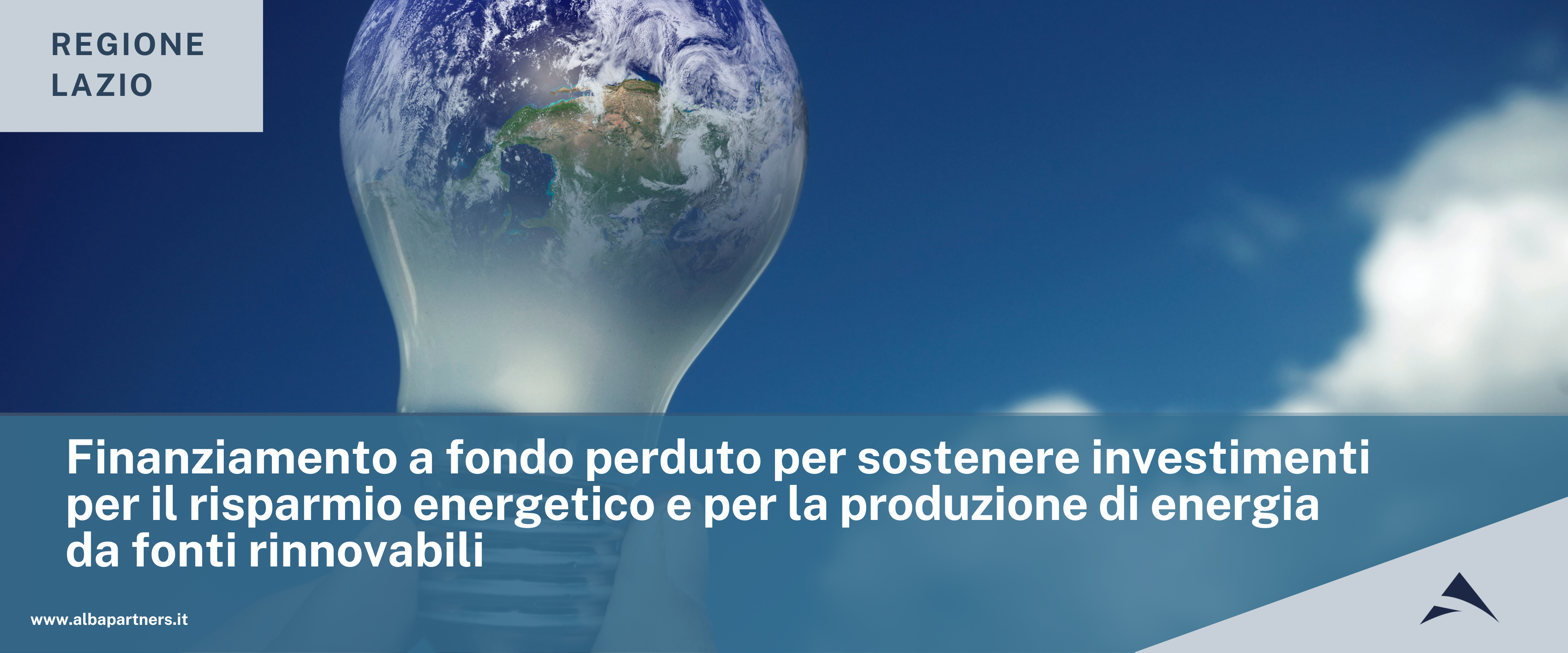 La Regione Lazio con questo Bando sostiene la realizzazione da parte delle imprese del Lazio di investimenti per il risparmio energetico e per la produzione di energia da fonti rinnovabili.