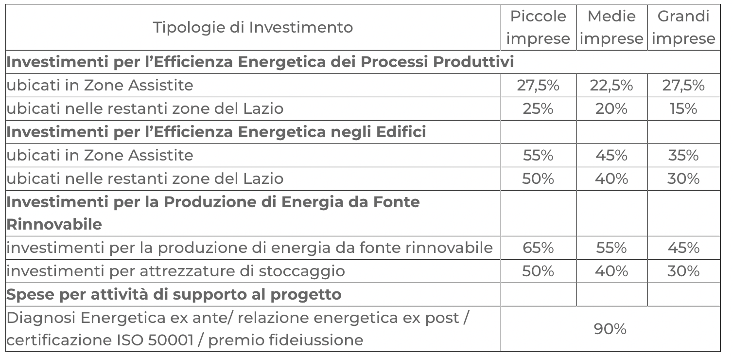 L’intervento è destinato ad Imprese con sede operativa nel Lazio. L’unità produttiva nella quale si prevede di realizzare l’investimento deve aver registrato complessivamente nell’anno 2023 consumi di energia primaria non inferiori a 60 MWh/anno.
