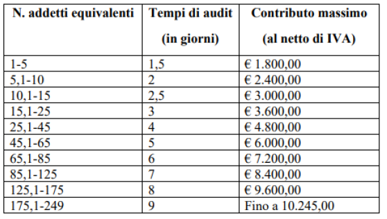 L’importo massimo per i servizi agevolati, per singola impresa, è comunque di 10.245,00 euro al netto di IVA, determinato sulla base dei tempi di audit previsti dal documento internazionale IAF MD 05 e riepilogati nella tabella che segue. Eventuali importi che superino tali limiti restano a carico dell’impresa beneficiaria.